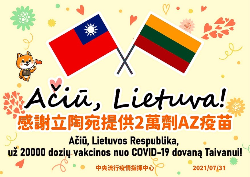 指揮中心說明,值此全球疫苗供不應求且疫情艱難時刻,立陶宛伸出援手提供這批COVID-19疫苗,給予國内疫情防治極大幫助,指揮中心謹向立陶宛政府與人民至上誠摯謝意。