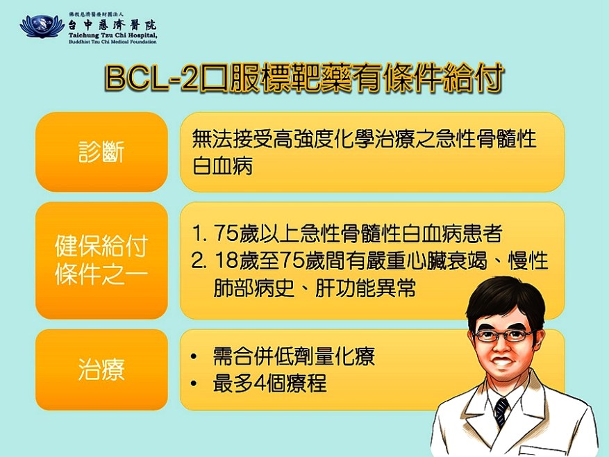 [新媒社 記者黃嘉雯/台中報導] 110年七月健保有條件納入血癌標靶藥給付,嘉惠無法接受高強度化療的血癌病人,同時減輕經濟負擔。臺中慈濟醫院血液腫瘤科醫師黃冠博指出,臨床已有心臟病變病史的血癌病人受惠,爭取到持續生存的機會。