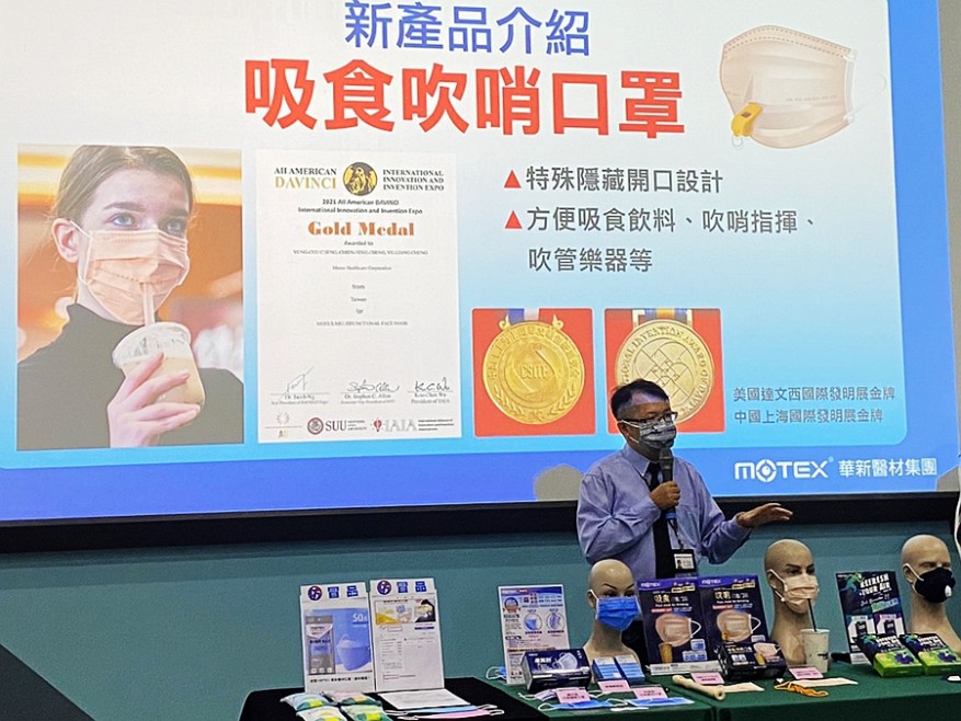 華新集團今日發表新產品,為解決日常使用口罩時的不便性,研發出各種功能性口罩。「防霾運動口罩」有單向呼氣閥,阻擋髒空氣進入,又可以快速散熱排氣,防疫期間在外運動時,配戴口罩也不會影響呼吸順暢;「吸食吹哨口罩」具有隱藏開口設計,方便防疫期間配戴口罩時可以同時吸食飲料、吹哨指揮或吹管樂器等,此款口罩更榮獲美國達文西發明展金牌;華新獨家創新研發「三高平面口罩」具有高氣密、高透氣、高濾效,密合度及防護效果可媲美N95口罩,由於呼吸阻抗很低,適合孕婦、兒童、氣喘民眾使用,產品售價較低,堪稱是平面口罩密合度大躍昇,用平面口罩的價格就可以享受N95的防護效果!