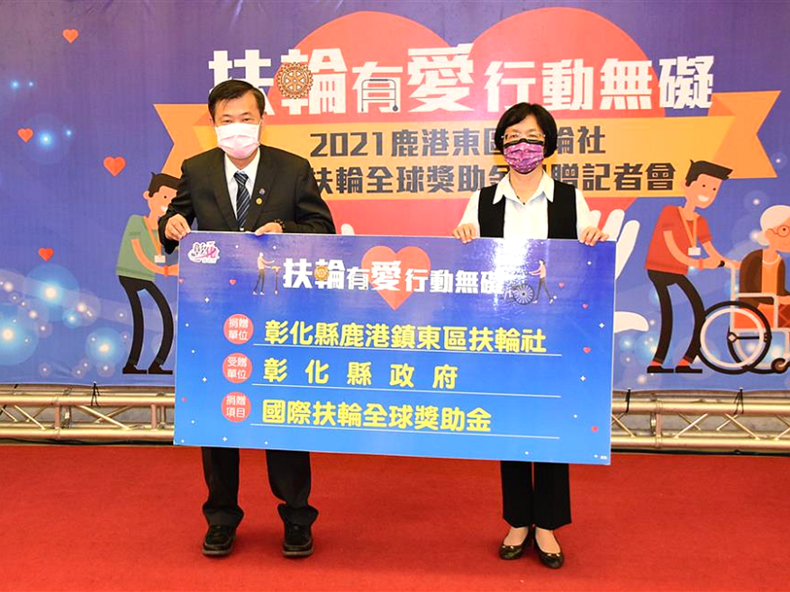 王縣長表示,感謝鹿港東區扶輪社,在創社後,對於教育、弱勢關懷不餘遺力,近年累積捐贈縣內學子近千萬,嘉惠千名學子,在108年捐贈一台反毒專車,疫情期間也捐贈面罩、防護衣等,對縣政府、對公益的支持不餘遺力、有目共睹,彰化縣總人數約125萬9千多人,身障朋友約7萬人,這次扶輪社再次發揮大愛的精神,藉由這次的捐贈,希望能幫助有需要的身障朋友減輕負擔。