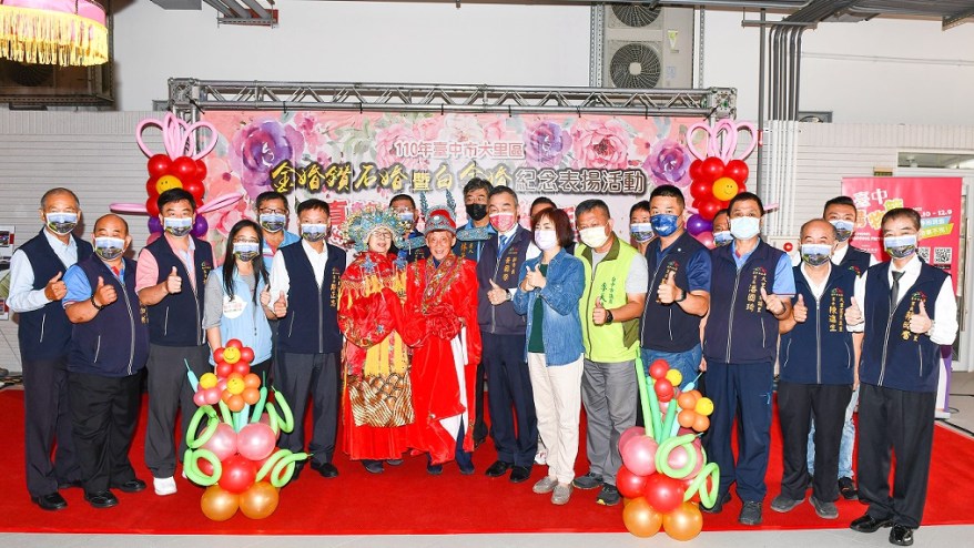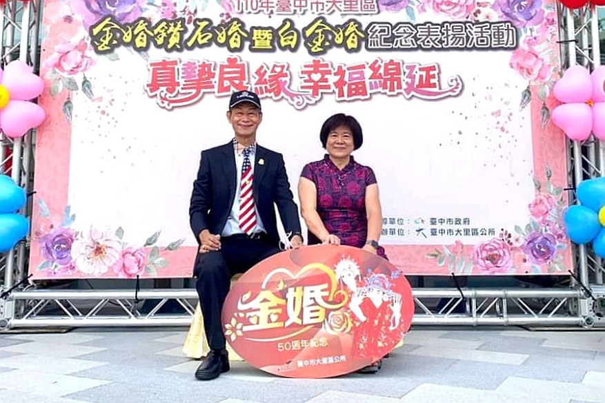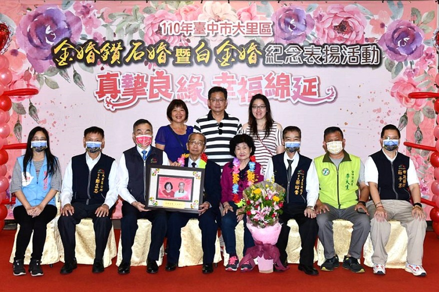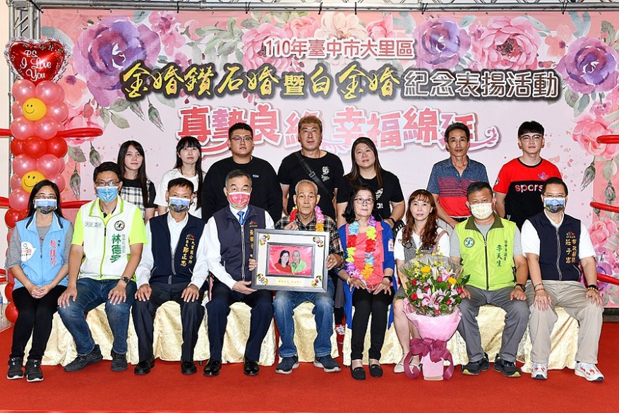[新媒社 記者張銀澤/台中報導] 大里區公所(23)日在台中市纖維工藝博物館地下室演講廳舉辦「110年金婚鑽石婚暨白金婚紀念表揚活動」,由副市長黃國榮及大里區長鄭正忠代表市長盧秀燕祝福在場結婚攜手超過50年以上恩愛的「牽手」夫妻,並祝福他們身體健康。活動會場特別致贈阿公阿嬤們客製化、獨一無二夫妻甜蜜合照的紀念獎牌、精美禮品及精緻伴手禮盒,並聘請專業攝影師拍下恩愛銀髮佳偶全家福照,讓受獎伉儷及親屬們留下美好回憶。