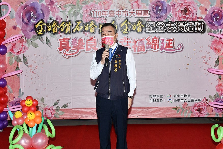 黃副市長表示,市府為協助市民照顧家中長輩,持續推動老人健保補助、假牙補助及修繕住宅補助、長期照顧服務、長青學苑及社區關懷據點等多項福利政策,提供長輩們最溫暖服務,讓台中市成為長輩們友善宜居的樂齡城市。今日活動現場佈置得溫馨又喜氣,要讓在場每對受獎伉儷留下珍貴回憶,每對夫妻都是佳偶天成,尤其結婚70年的白金婚今年有2對,實在不簡單,除樹立良好模範,也祝福長輩們身體健康。