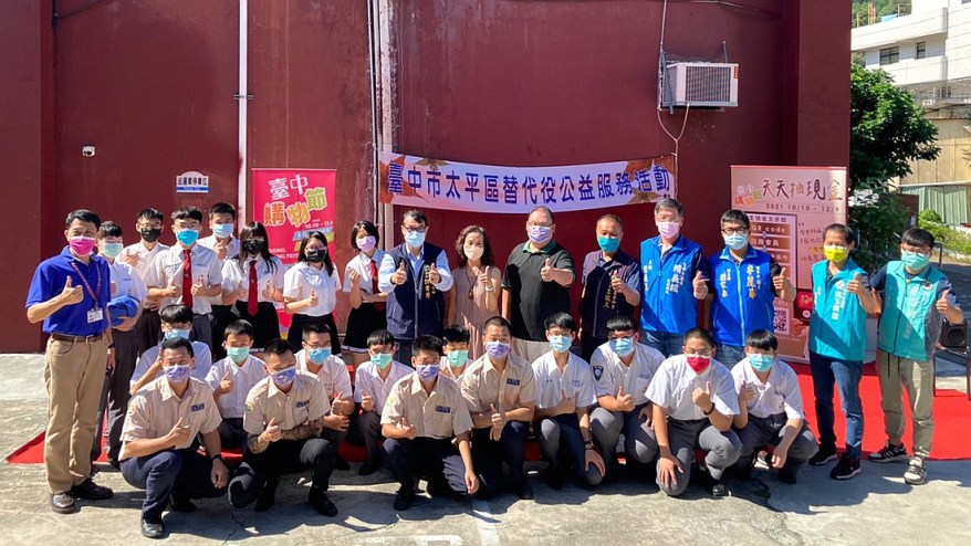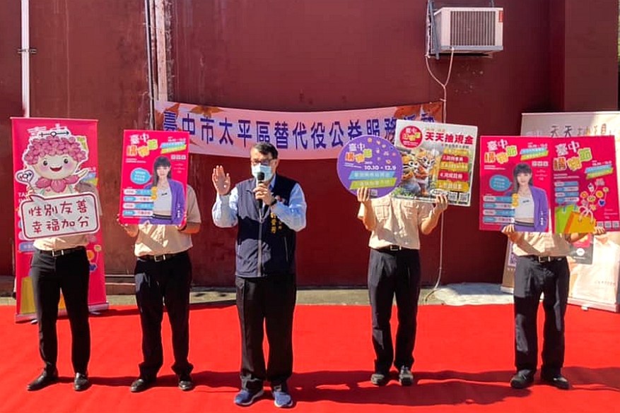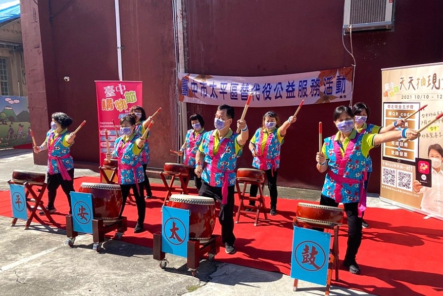 太平區替代役男兩造(照)雙役活動 許貴芳區長宣傳台中購物節。太平區公所配合內政部役政署「擴大替代役役男從事公益服務實施計畫」,辦理110年太平區替代役役男參與兩造(照)雙役-「偏鄉長者照護」與「美化社區環境」。「偏鄉長者照護」是運用替代役役男人力資源及專長,以頭汴社區長者為主,由替代役役男結合國立勤益科技大學USR長照課程,導入豐富多元的課程安排,讓長者在替代役陪同中活動筋骨強化身心。