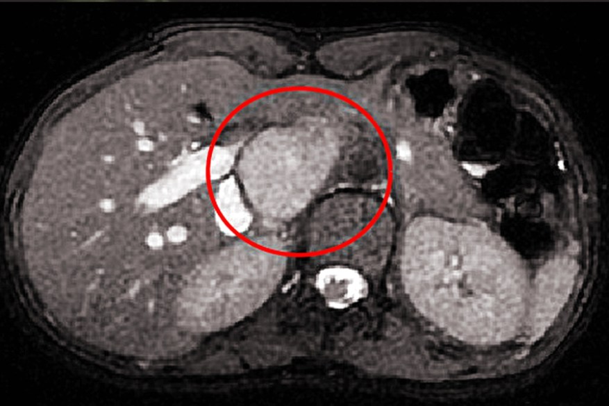 余政展主任從肝臟核磁共振檢查影像確認,腫瘤位於肝臟後面、脊椎旁邊,已經大到擠開腹腔多條大血管,唯一解決方式是切除病灶。但腫瘤被肝臟、胰臟與腎臟血管主動脈,還有下腔大靜脈等大血管緊緊包圍,必須小心沿著大血管手術,稍一閃神幾千毫升的大失血,可能就是病人的生死關頭。