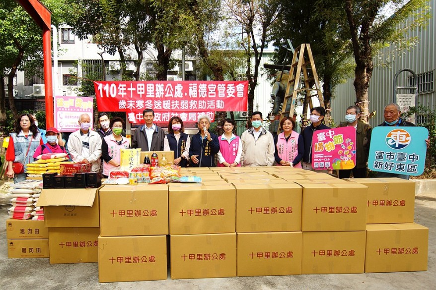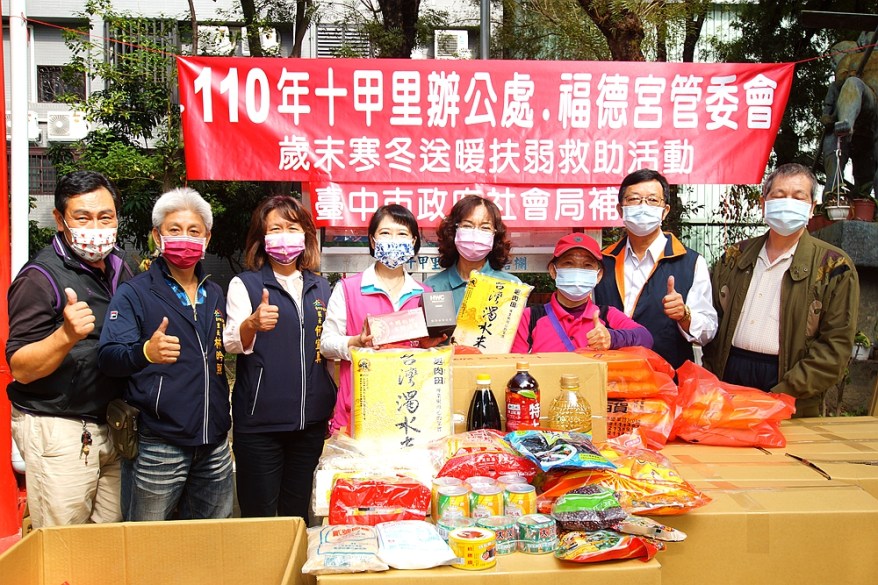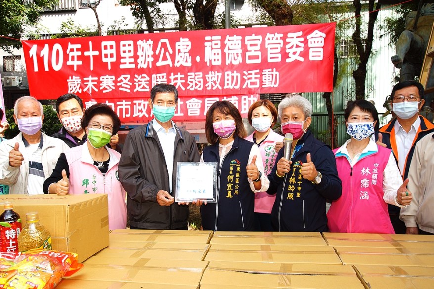 [新媒社 記者張銀澤/台中報導] 110年台中市東區十甲里辦公處、福德宮管理委員會,11月12日福德宮廣場舉行十甲里寒冬送暖、關懷弱勢活動,提供低收入戶及邊緣戶關懷慰問金每名2000元。十甲里善心人士捐款兩萬元購買白米每名3公斤裝三包,里長辦公室籌50箱物資每名一大箱,林霈涵市政顧問加贈每名黑沃咖啡一盒及10片口罩。