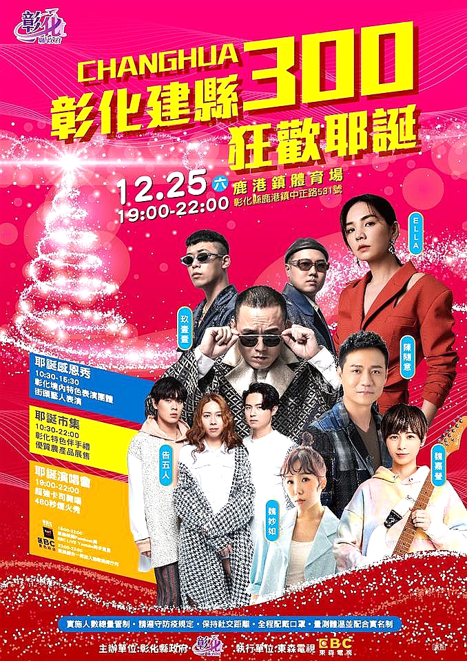 活動當日從早上10點30分開始,就有好吃好逛的「耶誕市集」,舞台區還有「耶誕感恩秀」邀請彰化境內特色表演團體與街頭藝人為活動揭開序幕,晚間7點至10點「彰化建縣300 狂歡耶誕」耶誕演唱會隆重登場,將由鹿港昇動舞蹈團的表演拉開序幕,精彩的節目內容還有「新台妹」魏妙如、文青歌手魏佳瑩、金曲天團告五人、唱將總鋪師陳隨意,壓軸藝人更邀請到台客嘻哈天團玖壹壹、秒殺天后ELLA陳嘉樺(演唱會1千張票60秒完售等級),人氣卡司輪番上陣,加上長達480秒璀璨煙火秀,絕對精彩可期!歡迎全國民眾到彰化旅遊、消費、過耶誕,預祝大家在新的一年,用最歡愉、最振奮的精神共同迎接2022年!