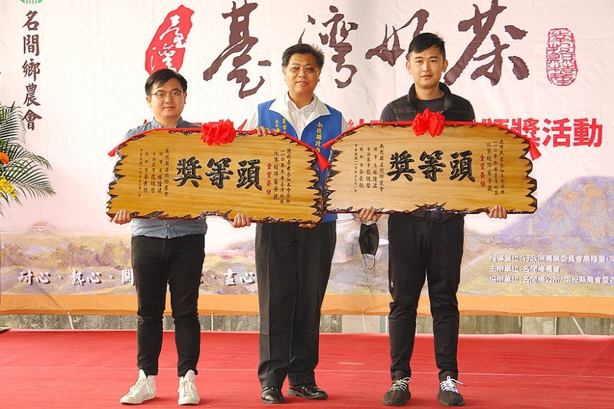 [新媒社 記者張銀澤/南投報導] 2021名間鄉農會冬季台灣好茶比賽暨農特產品展售會,(26)日在該農會廣場登場,在農糧署中區副分署長洪宏毅及南投縣農會總幹事曾明瑞等貴賓見證下,縣府農業處長陳瑞慶代表林縣長頒匾表揚兩位分別獲得烏龍及金萱特等獎得主陳璿吉、唐育聖,場面隆重榮耀。 陳處長同時籲請茶農重視茶葉安全用藥及合理施肥。