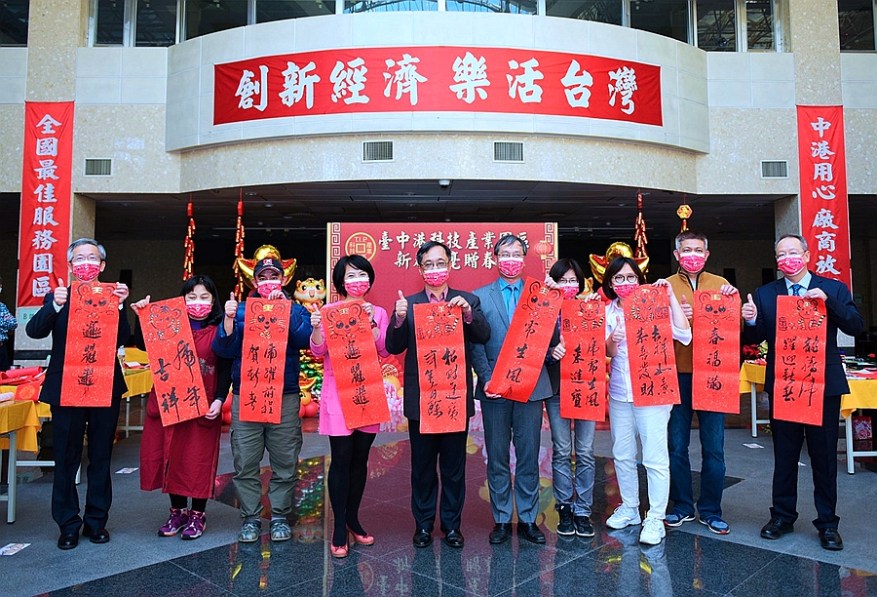 [新媒社 記者張銀澤/台中報導] 為迎接虎年到來,經濟部加工出口區管理處中港分處與臺中市臺中港科技產業園區廠商協進會(原名稱:臺中市中港加工出口區廠商協進會)於111年1月14日在該分處行政大樓(梧棲區大觀路6號 )2樓大廳,共同舉辦111年「福虎生豐迎新春、新春揮毫贈春聯」活動,這次特別邀請6位書法大師現場揮毫,免費提供200幅春聯及春、滿、福等「春仔」與「恭喜發財」等四字聯,民眾可憑號碼牌免費索取,本活動約百人參加,熱鬧非凡!