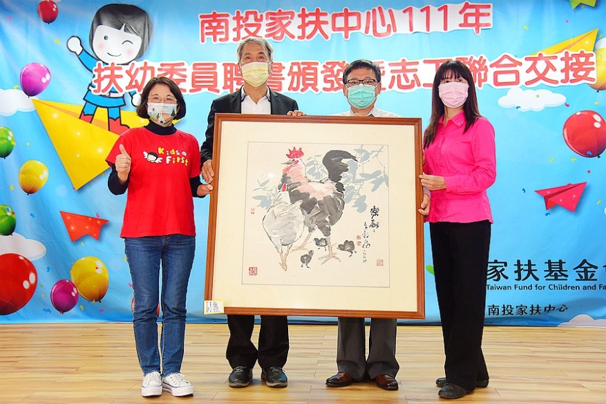 立委羅美玲、縣議員賴燕雪、張嘉哲也到場致意,會中由主委陳學堂頒發111年扶幼委員聘書,南投家扶中心主任魏季李位志工等後援團體授證並主持交接儀式,過程溫馨隆重。51年前曾受中心扶助的扶幼委員張金來也當場認購李轂摩大師作品,並捐贈10萬元扶卓獎助學金,鼓勵孩子向上。