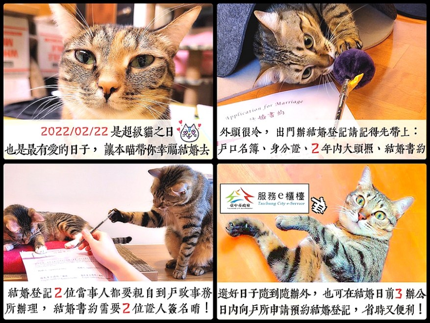 民政局並說明,2月22日同時也是超級「貓之日」,由於日文讀音的「2」與貓叫聲相似,民政局也呼應時事,於官方臉書與「台中戶政ONLINE」等社群,推出可愛喵星人的梗圖吸睛文案,藉著「貓寶貝」的賣萌高人氣宣導結婚登記須知。另外,神岡戶所則推出貓咪福袋,呼籲民眾趁「222」這天把男友女友速速收編;而霧峰戶所也推出一日限量版「貓貓明信片」,讓「貓主子」給新人們增添喜氣。