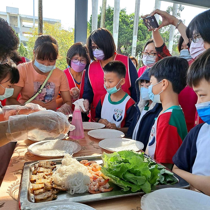四年級學生親自體驗手作越南春捲,在老師及愛心媽媽的協助下,小朋友將米線、蝦仁、肉片、生菜等食材用春捲皮包起來,再沾特製的魚露醬,酸甜清爽的口感,令人回味無窮。思蓉營養師很用心,配合此次越南文化教育的推動,特別將越南河粉規劃在午餐菜單中,讓全校師生都能品嚐到越南風味的美食。