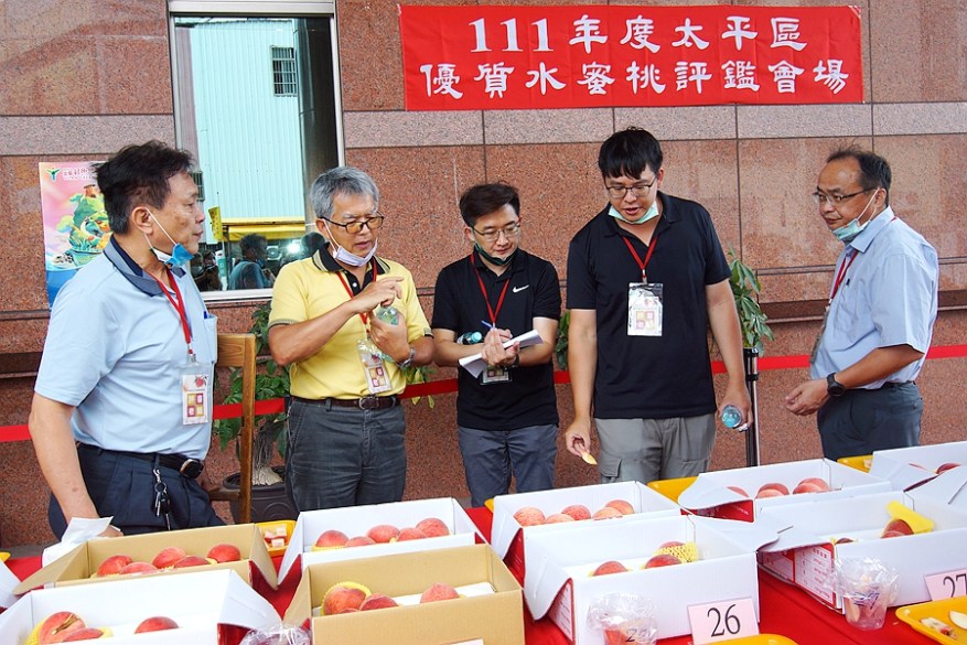 [新媒社 記者張銀澤/台中報導] 臺中市政府農業局為推廣本市優質農特產品,並提升本市平地水蜜桃果品品質,特輔導太平區農會於4月26日(星期二)於該會舉辦「111年臺中市太平區優質水蜜桃果品評鑑活動」,計30組農友報名參賽。今天有立法委員何欣純服務處廖冏勳主任、臺中市議員李麗華、臺中市議員蔡耀頡服務處曾正揚特助、臺中市政府市政顧問莊子富、臺中市政府農業局蔡精強局長、太平區農會胡文達理事長、鄧晉隆常務監事、余文欽總幹事帶領農會團隊一同共襄盛舉。