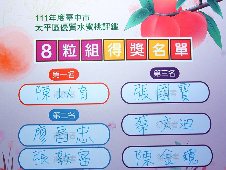 本次評鑑活動邀請行政院農業委員會農糧署中區分署、農業試驗所及臺中區農業改良場等農業學術研究單位代表擔任評審委員,就水蜜桃外觀果形、質地風味及糖度等項目進行評分,第一名可獲得獎金8,000元,第二名可獲得獎金5,000元,第三名則可獲得獎金3,000元,經評審仔細品嘗評分後,由陳以育勇奪冠軍,成為今年度的平地水蜜桃達人,第二名為廖昌忠及張敦富2位,第三名分別為張國寶、蔡文迪及陳金鑧3位;另今年由曾金塗種出太平區最大顆的紅鈴水蜜桃,奪得今年度的水蜜桃王。