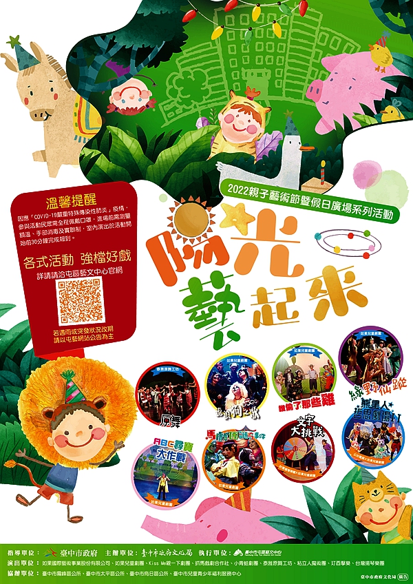 屯區藝文中心說明,「2022親子藝術節暨假日廣場系列活動」詳情及售票資訊,可至中心官網( http://www.ttdac.taichung.gov.tw )、臉書粉絲專頁( https://www.facebook.com/ttdac )查詢,活動如因疫情等因素異動,以官網公告為主。因應國內疫情,屯區藝文中心均落實中央流行疫情指揮中心防疫規範,請民眾參與活動時配合量測體溫、手部酒精消毒、全程佩戴口罩及保持安全社交距離,並鼓勵大家完成第三劑疫苗注射及手機下載「台灣社交距離」APP,安心參與各項活動。