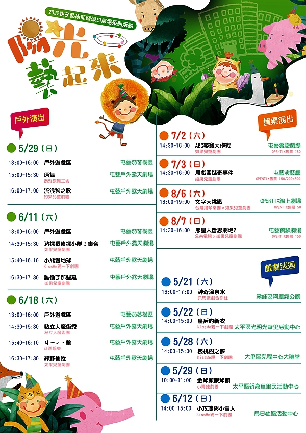[新媒社 記者黃嘉雯/台中報導] 台中市屯區藝文中心「2022親子藝術節暨假日廣場系列活動」5月熱鬧登場!今年以「陽光藝起來」為主題,自5月21日至8月7日,將有室內劇場、戶外露天劇場及戲劇巡迴等多場演出,並結合戶外廣場推出系列親子節目和遊戲區,歡迎民眾參與多采多姿的藝文體驗,感受兒童劇魅力。