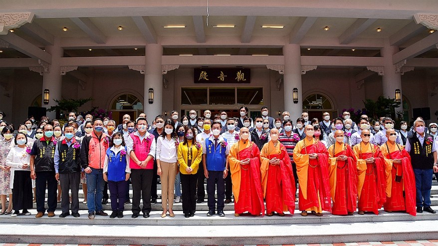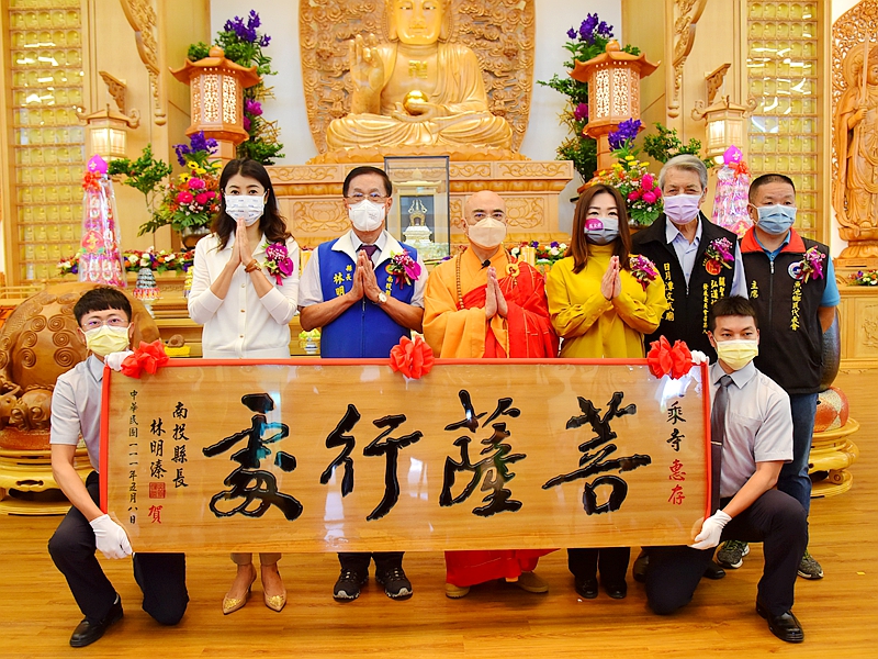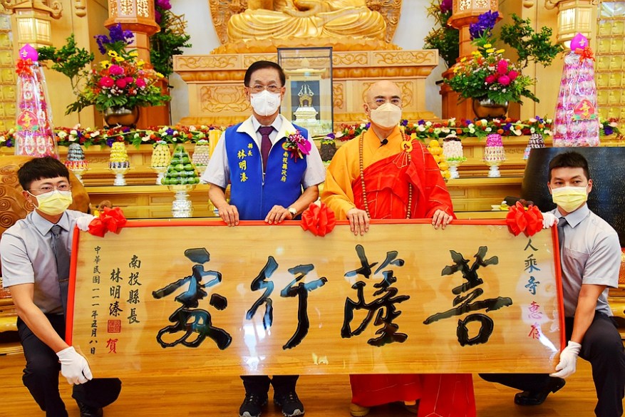[新媒社 記者張銀澤/南投報導] 歷經重建人乘寺落成啟用 林縣長贈匾祝福 921大地震後,歷經20多年重建,魚池鄉人乘寺文殊院終於完成重建,8日上午隆重舉辦落成大典暨佛像開光安座法會,由住持大願法師主持,縣長林明溱、立委許淑華、馬文君、行政院中辦執行長蔡培慧、魚池鄉長劉啟帆都出席大典,林縣長致贈老和尚法語墨寶「菩薩行處」匾額,祝福落成啟用,並和各界人士一起簽菩提葉祈福卡為臺灣和世界祈福,祝願「新冠疫情早消弭,災厄遠離致祥和,國界安寧兵革銷,風調雨順民安樂。」