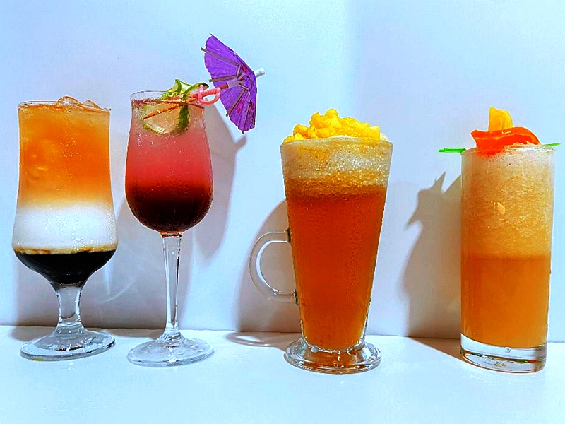 3 綠妝粉艷登場:以臺茶 25 號為基底茶,該茶含有高量的花青素,為臺灣茶史上第一個命名之紫芽茶樹新品種,其經產製不同茶類讓茶飲呈現視覺動態的變化及滋味的新組合。本調飲採下層為具咖啡色且幽雅蘭花香的紅茶,搭配上層的綠茶,再以本土檸檬汁讓綠茶呈現粉紅色,經混合後,國產檸檬綠茶及紅茶創造出的清香帶有幽雅花香且口感甘醇,讓視覺及味覺有雙重刺激。