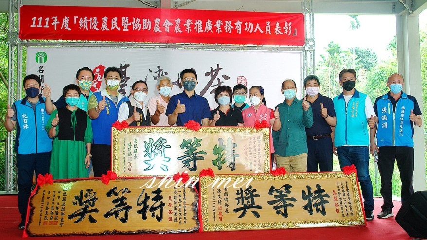 [新媒社 記者張銀澤/南投報導] 南投名間鄉農會22日在該會大廣場盛大舉辦「2022春季臺灣好茶評鑑」、「111年度績優農民表彰」頒奬典禮暨農特產品展售活動,由理事長林隆波主持,縣府農業處長陳瑞慶出席致賀,並頒發縣長特等獎匾額給烏龍組特等獎得主唐育聖及金萱組特等獎得主李志展,並感謝農民辛苦付出,用心管理生產,農會盡心輔導,讓南投縣農產揚名國內外,陳處長也邀請全國愛茶民眾到南投找茶喝茶,買好茶。