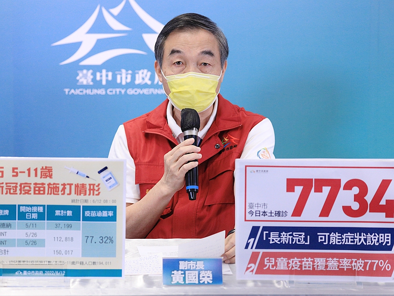 黃副市長說明,台中市兒童疫苗施打覆蓋率越來越高,統計至昨日止,兒童莫德納已施打3萬7199人,兒童BNT已施打11萬2818人,總人數已施打15萬17人,覆蓋率已達到77.3%;另外,近期有些確診者康復後一段時間仍然不舒服,也就是所謂的「長新冠」,對此,台中市有15家醫院提供「染疫康復者整合門診」服務,讓市民方便就醫;此外。就目前的公衛文獻來看,長新冠患者不會傳染給其他人,請民眾放心。