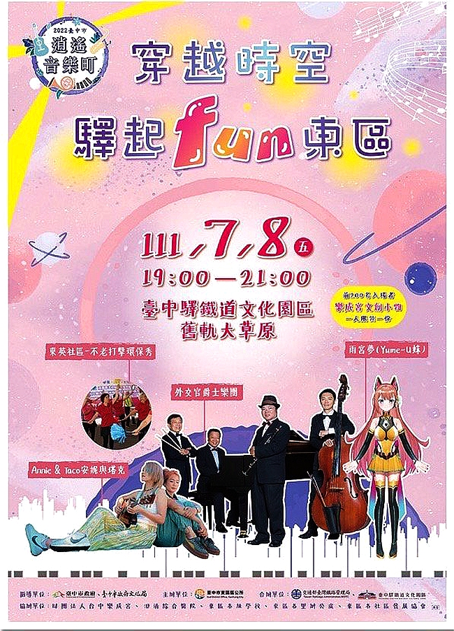 [新媒社 記者黃嘉雯/台中報導] 今夏東區最受矚目的音樂盛會~【2022臺中市逍遙音樂町-穿越時空 驛起fun東區」】音樂會,於7月8日(五)夜晚隆重當場