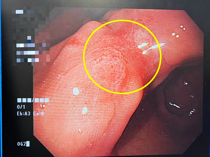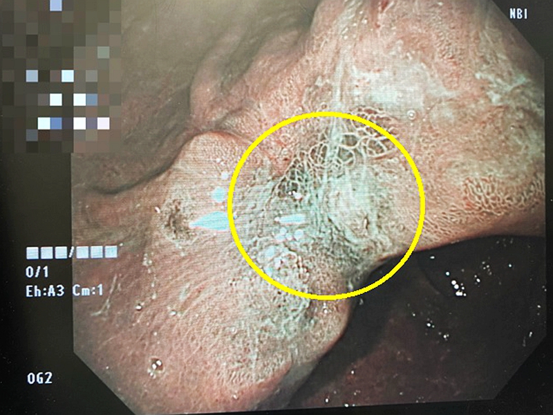 透過最新型的NBI窄頻光波腸胃內視鏡(俗稱腫瘤照妖鏡,可偵測早期癌症)檢查,發現二處不太正常的細胞表現,切換成特殊光源更是明顯不對勁,很有可能是惡性的潰瘍細胞,兩週後切片報告證實是胃腺癌,又驗出有幽門桿菌,代表病患之前幽門桿菌都沒有處理,後續安排手術治療及幽門桿菌的治療,因算是早期胃癌,癌細胞也有沒遠處轉移,術後癒合還不錯,定期追蹤即可。