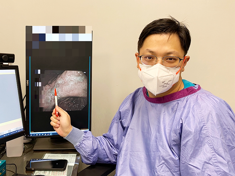 許鈺銓醫師表示,病人其實一月份就來過,有抽菸和長期腹脹、腹痛、吃不太下的狀況,細問下得知有長期胃潰瘍病史,那時就建議他要做胃鏡,但因為之前才在他院做過意願不高,所以只能提醒可能的風險並給予藥物治療,二、三個月後發覺症狀變嚴重,好說歹說下才終於答應做胃鏡。