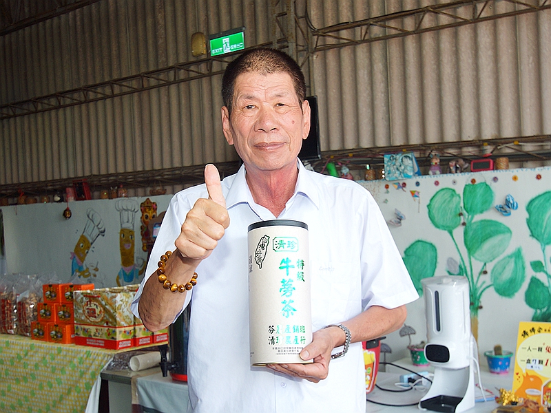 總經理 許景相表示牛蒡本身含有豐富的膳食纖維、鈣、鎂、鋅、胡活蔔素等元素,其中裏頭的胡蘿蔔素比真正的胡蘿蔔的2.6倍,另外牛蒡還有17種氨基酸,可謂營養的寶庫。 【商品特色】 ★本茶採精選新鮮天然牛蒡,以最新科技輔以古法精製而成 ★適男女老少,休閒洽談之良伴,適合長期飲用。 ★與清水煮沸慢火10~15分鐘,可常期使用。 *與少許枸杞子煮大沸10分鐘當茶喝。 *與肉骨一起熬湯為一營養之美味佳餚。 *本產品經科學衛生高溫處理,可安心食用。此次宣導活動讓民眾能時時注意自身的保健知識及觀念。