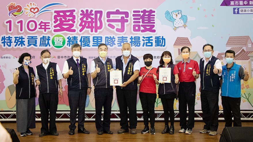 [新媒社 記者黃嘉雯/台中報導] 台中市政府今(24)日於西屯區公所舉辦「110年愛鄰守護特殊貢獻暨績優里隊表揚活動」,副市長黃國榮代表市長盧秀燕頒發豐原區豐田里、潭子區東寶里、大甲區頂店里、大安區龜壳里、太平區中興里、西屯區大鵬里、南屯區文心里、西區公益里、南區南門里、北區錦村里10隊愛鄰守護特殊貢獻里隊及91隊績優里隊,感謝他們協助台中防疫,為市民創造幸福。