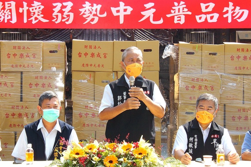 台中樂成宮郭松益董事長表示:今年樂成宮普桌共計4600餘桌,其中近2千3百桌供品民眾慷慨捐出,加上今年募集愛心白米超過4萬多斤,用來擴大幫助有辦理長照單位及鄰里關懷據點,希望藉由樂成宮這次捐贈儀式能夠拋磚引玉,對社會公益表達關切與重視,讓社會各界的愛心持續挹注,鼓勵大眾可以攜手送暖,挹注愛心,使每個弱勢家庭或社福機構都能感受社會溫情,讓中元普度更具意義。