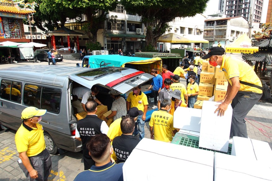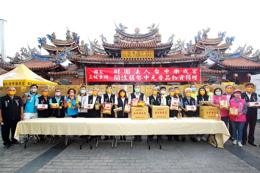 全省宮廟均會結合鄰里民眾準備豐盛祭品,於農曆七月擇日舉辦祭祀活動。部分民眾會將祭品捐出,為使所捐物資物盡其用,台中樂成宮也透過各界愛心捐出,統一發放給需要弱勢家戶及社福單位,避免資源浪費,讓民眾能夠感受宮廟關懷與照顧,雪中送炭、寒冬送暖一直是國人善行美德,確實有助社會善良風氣。
