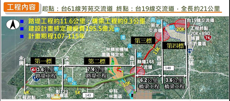 工務處表示,「東西向快速公路台76線台19線以西延伸工程」計畫總經費達195.5億元,分成四個標案: