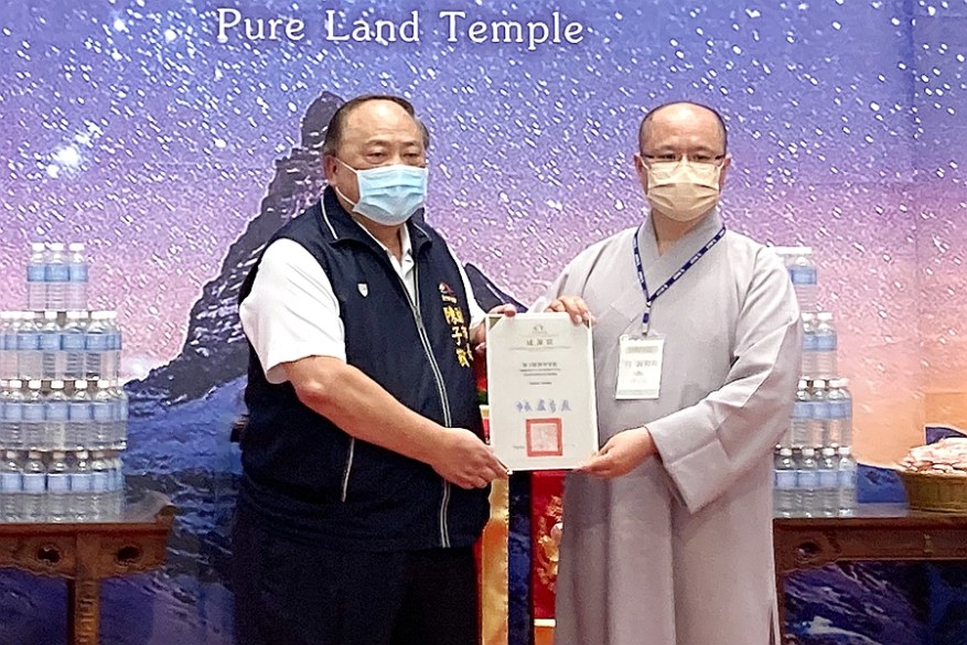 [新媒社 記者張銀澤/台中報導] 淨土院台中分院今(27)日舉辦水陸空大齋勝會,慷慨解囊,捐贈台中市政府和民間團體200萬元和200箱素食乾糧,協助弱勢家庭、弱勢團體、身障機構和街友。副市長陳子敬出席代表受贈並致贈感謝狀,感謝淨土院台中分院慈悲為懷,無我無私,濟苦救貧。