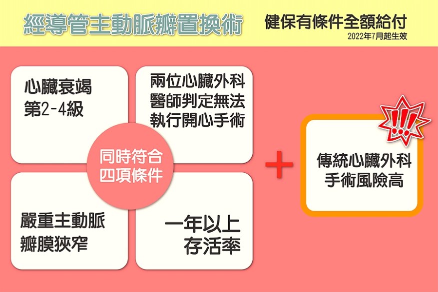 老翁手術當時受惠於健保制度更新,成為臺中慈濟醫院此手術的首例健保個案。余主任表示:「今(2022)年七月健保再度擴大條件,年齡限制已取消。」他說,微創「經導管主動脈瓣植入術」只需從病人兩側鼠蹊部穿刺約0.5公分傷口,過程也只要局部或鎮靜麻醉,不必讓心臟停止跳動,大幅降低感染併發症及手術死亡風險。果然,老翁手術後三天能下床走動,一周就能出院。