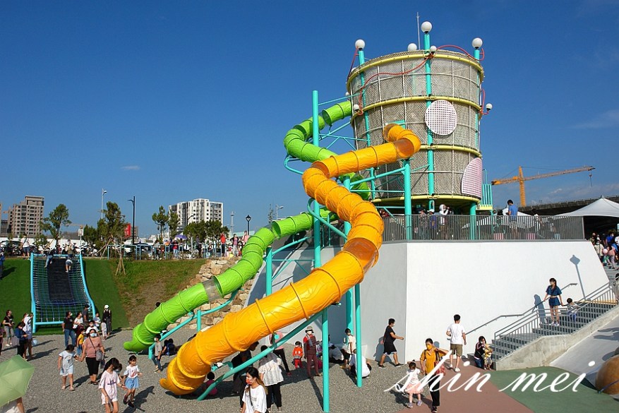 「全國公園中最高溜滑梯!」今日吸引許多家長及小朋友體驗全台公園最高溜滑梯、攀爬設施、彈跳床、鞦韆、籃球場及寵物專區等,宛如遊樂園般熱鬧。盧市長說明,馬卡龍公園最吸睛的是如漂浮於空中的遊戲塔,市府利用地形起伏,設置高度達11公尺的溜滑梯,遊戲塔內也設置多種挑戰攀爬設施,各項遊戲設施皆符合兒童遊戲場CNS國家標準,讓孩童在遊戲塔可以充分遊玩,家長也安心。