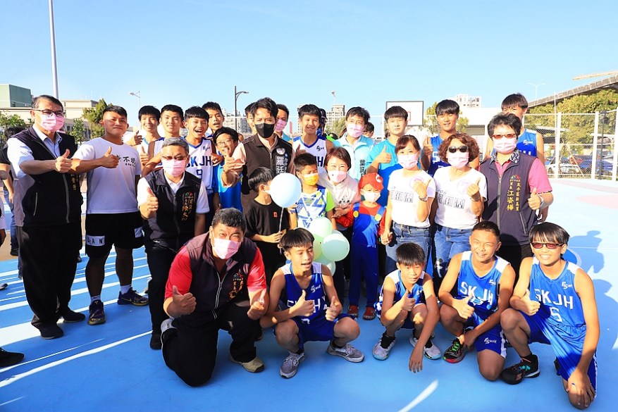 「顏色最繽紛!」盧市長提及,許多公園都以地名命名,當初在設計規劃以馬卡龍色系為公園特色,因此正式命名時,市府決定大膽以此為名,象徵這是一座色彩繽紛、充滿童趣的公園;此外,這也是一座與各年齡層和毛小孩都共融的公園,更是一座環保公園,籃球場是利用2018花博棚架鋼管,經除鏽烤漆後,再生為圍籬支柱,並以馬卡龍色系搭配不規則曲線,讓民眾打球時有不同的運動體驗。