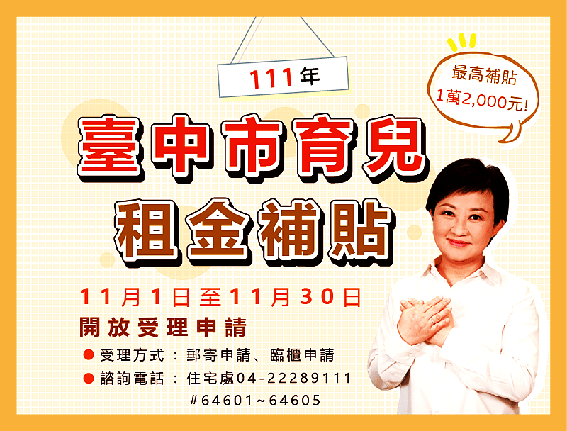 「台中市育兒租金補貼」 即日起至11/30開放申請 !