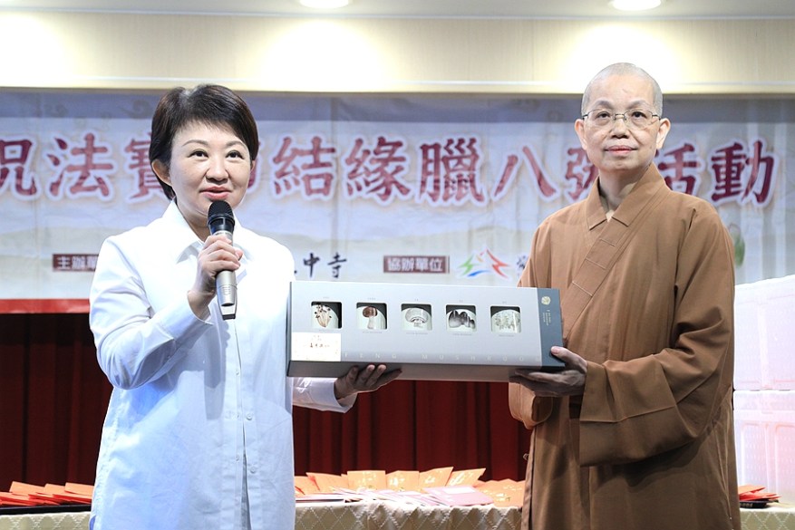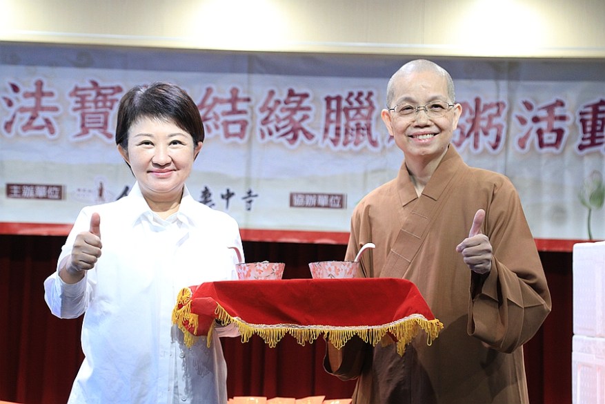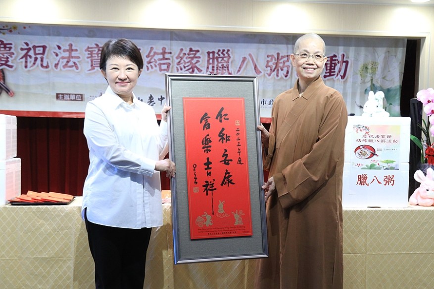 [新媒社 記者黃嘉雯/台中報導] 農曆十二月初八為佛陀成道日,又稱「法寶節」,佛光山惠中寺為感謝台中市政府長期對市政貢獻,今(27)日準備臘八粥、春聯及紅包致贈洽公民眾及市府員工。市長盧秀燕出席法寶節結緣活動時表示,過去2、3年因新冠肺炎疫情,市民過得很辛苦,期望今年的臘八粥能帶來平安、健康、幸福,保佑疫情早日退散,也期許市政推動順利。