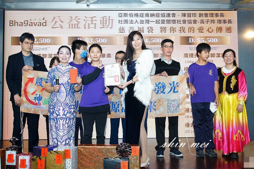 會中薄伽梵國際股份有限公司許洳銀董事長捐出四十份福袋義賣,並且特別邀請陳習珍理事長與高子羚愛心大使,介紹台中市亞斯伯格症肯納症協進會的創會理念與台灣夢想起飛樂團的成員與眾多家長和社會熱心友人的支持,讓星兒有歸屬感,以及學習與發揮才藝的機會。