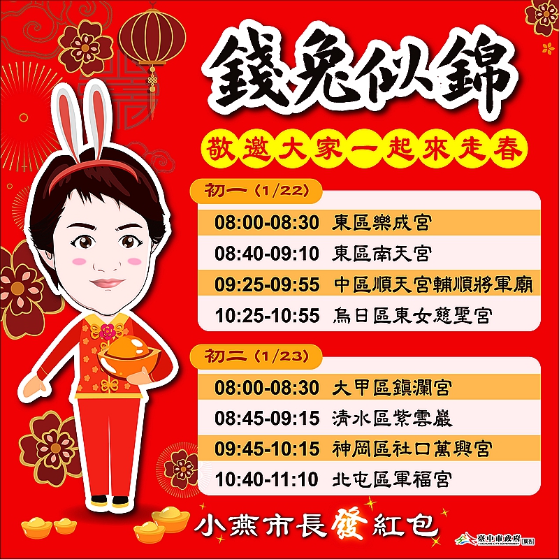 台中盧市長 初一、初二- 8宮廟發「錢兔小紅包」 !
