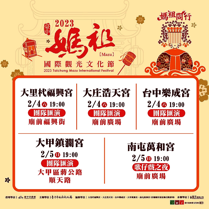 文化局提到,「2023台中媽祖國際觀光文化節」系列活動即日起至5月21日於台中市12座宮廟熱鬧展開,後續並將配合媽祖起駕時程,在大甲鎮瀾宮周邊辦理起駕戲和觀禮台活動;5月份在台中萬春宮、北屯南興宮、社口萬興宮、豐原慈濟宮、大肚萬興宮、梧棲朝元宮等宮廟還有多場演出。相關活動詳情歡迎至台中市政府文化局網站查詢。