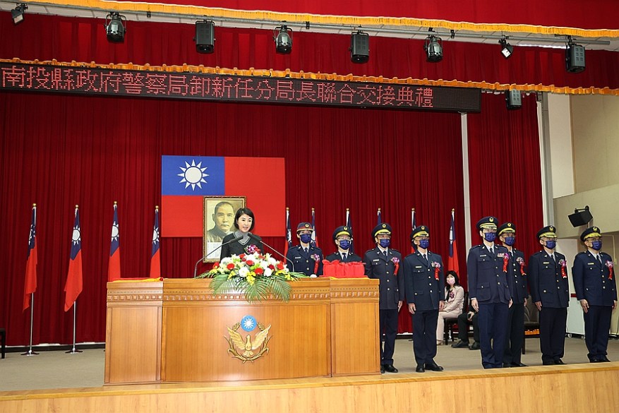 [新媒社 記者黃嘉雯/南投報導] 南投縣政府警察局異動人員有主任秘書、督察長暨南投、草屯、埔里、竹山、中興、集集、仁愛及信義分局分局長等共10名。9日上午縣長許淑華親自主持於縣警局6樓大禮堂舉辦卸、新任分局長聯合交接典禮,擔任監誓人並為晉升2線4星的新任分局長授階。