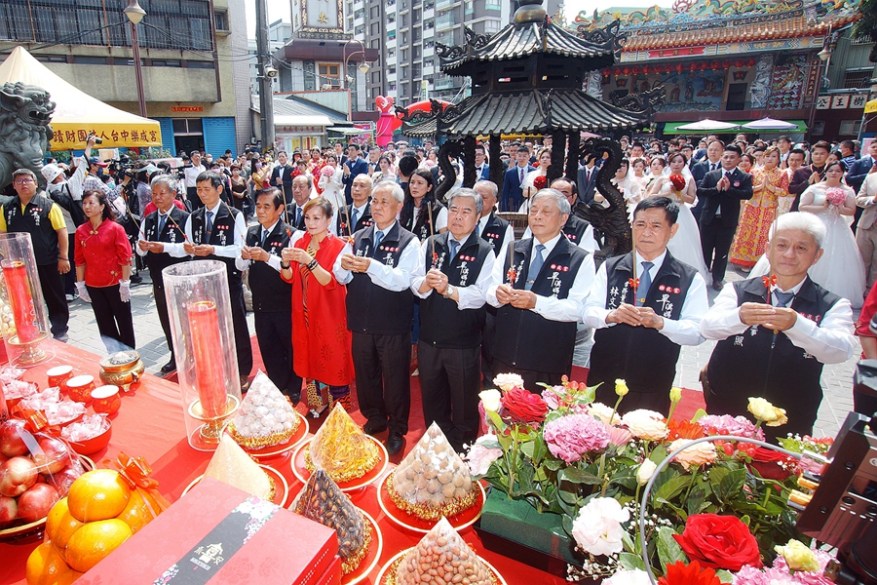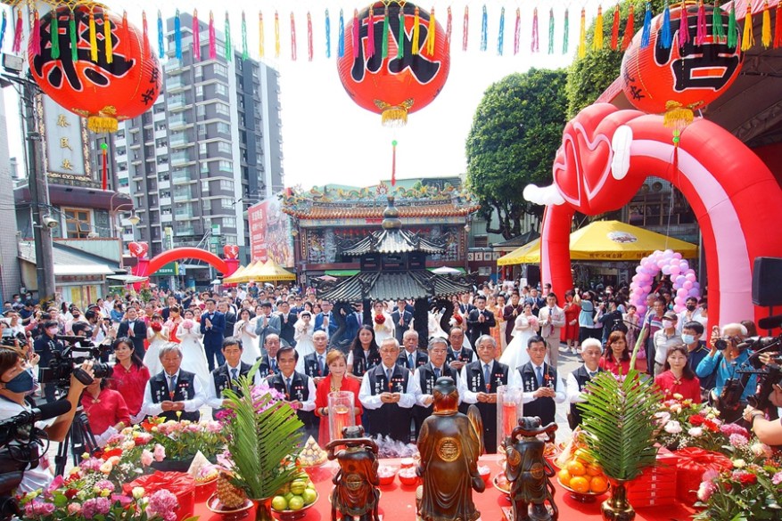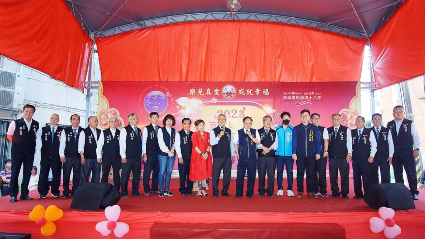 樂成宮第五屆集團結婚今天在民政局吳世瑋局長代表盧秀燕市長和數位治理局局長林谷隆、東區公所吳忠聖、東區戶政喻梅芝主任及各級民意代表主任、助理、蒞臨指導,樂成宮董事長郭松益帶領全體董監事參與,旱溪媽祖守護您幸福到老,活動從地球村幼兒園小朋友的熱情表演,帶動現場歡樂氣氛和滿滿的祝福。