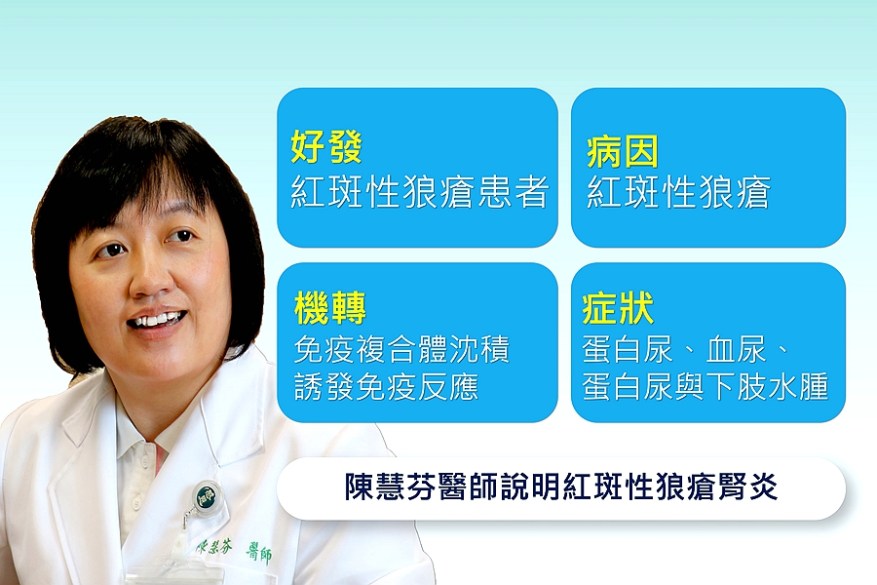 陳慧芬醫師指出,紅斑性狼瘡是自體免疫的全身性疾病,自身抗體會攻擊全身包括:中樞神經、腎臟與心臟等器官,其中腎臟是最常受侵犯的器官之一。臨床統計,超過60%至70%的紅斑性狼瘡病人會出現狼瘡性腎炎,成因是病人的免疫複合體容易沈積在腎臟,誘發免疫反應進而傷害腎臟,初期症狀不明顯,臨床表現有蛋白尿、血尿,蛋白尿嚴重時會像婦人出現下肢水腫。陳醫師以相關研究報告提醒,一到三成的活性狼瘡性腎炎病人,若無早期接受適當治療,可能導致末期腎臟病,甚至有致死風險。