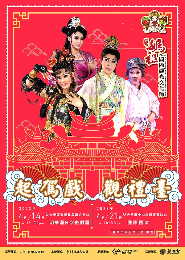 文化局表示,大甲媽祖遶境進香已登錄為台灣重要民俗活動,是全台最重要的宗教盛事之一,今年配合媽祖遶境和農曆3月媽祖誕辰,4月14日晚上7時在大甲區蔣公路及育德路口演出「起駕戲」,邀請由台灣第一丑角陳勝在與當家小旦鄭雅升夫妻所成立「明華園日字戲劇團」,演出《紅塵愛-猩不了情》,描述一段生死無悔、刻骨銘心的人妖戀愛物語,劇情融入傳統川劇變臉,搭配視覺系化裝特效與現代專業舞台技術,呈現出半人半獸的妖魔猙獰面貌,卻無怨無悔地追求紅塵愛情的強烈對比。
