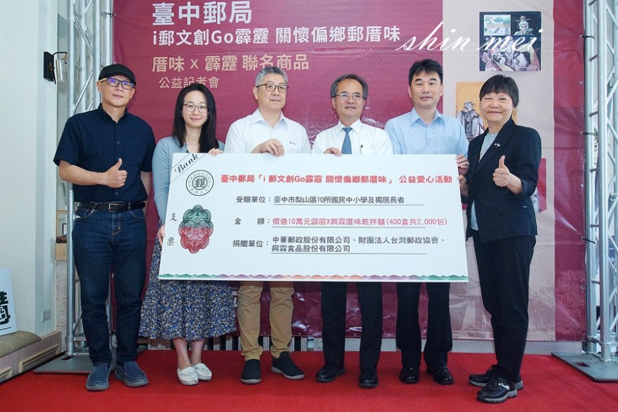 中華郵政江瑞堂總經理表示,中華郵政與時俱進,在堅守郵政普惠任務之餘,更積極帶領團隊朝永續發展的目標前進,地方文化紀錄著臺灣社會珍貴的歷史、軌跡及價值,很開心中華郵政能發揮影響力,整合郵政物流、電商及集郵等資源,與外部單位共同攜手推廣臺灣具有價值的在地文化,讓民眾能便利享受美味兼具藝術文創的優質商品。同時拋磚引玉,由中華郵政公司、台灣郵政協會及興霖食品率先響應,合計捐出價值10萬元(400盒共2,000包)「厝味X霹靂聯名乾拌麵」給臺中梨山地區偏鄉弱勢家庭學童及獨居長者,喚起民眾對弱勢族群的關注並帶動各界的協助。
