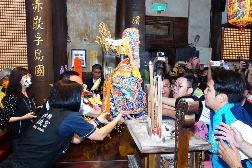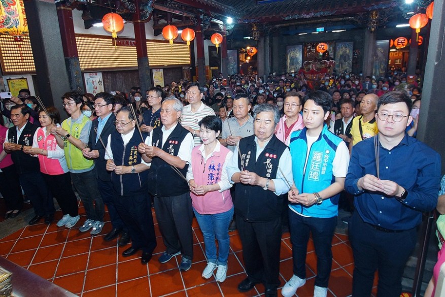 [新媒社 記者張銀澤/台中報導] 112年台中樂成宮旱溪媽祖遶境十八庄,為期22天,行經11區、116里為地方祈福,沿途受到信眾熱烈歡迎,氣氛熱絡,媽祖鑾轎112年5月11日晚在號角隊、鑼鼓陣護衛下回鑾安座,遶境圓滿順利。市府民政局局長吳世瑋代表市長盧秀燕恭迎媽祖回鑾,並祈求媽祖保佑台灣國泰民安、風調雨順。