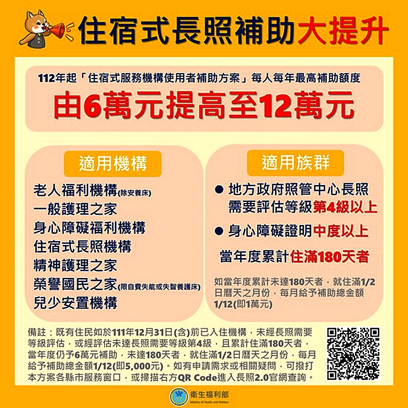 [新媒社 記者張銀澤/彰化報導] 為緩解中、重度失能者接受機構式服務之家庭經濟負荷,衛生福利部自112年起調增「住宿式服務機構使用者補助方案」,補助額度由最高6萬元提高至12萬元,並取消排富規定。