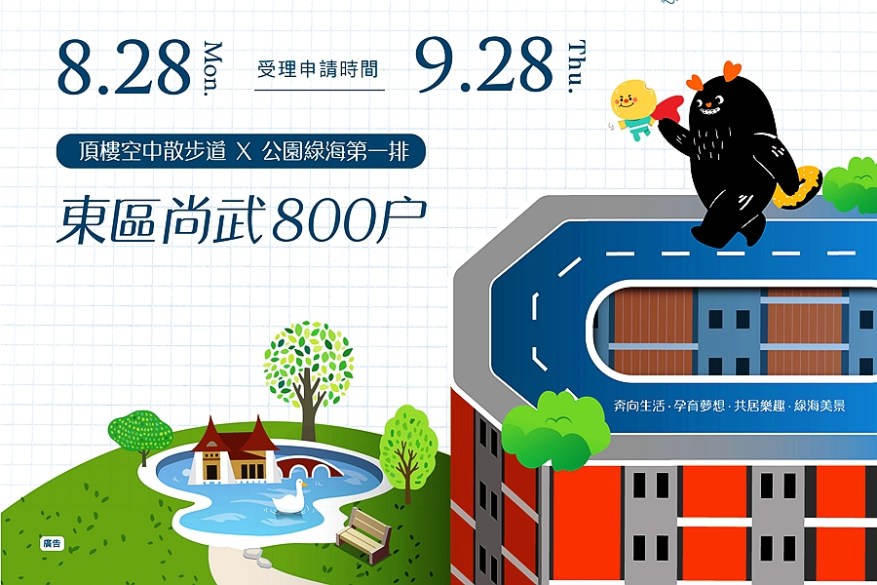 [新媒社 記者黃嘉雯/台中報導] 台中市黃金級地段,東區第1座社會住宅-東區尚武好宅,因鄰近多所知名學校及商圈,車行5分鐘就可抵達台中火車站,整體位置集交通、教育、環境、娛樂及醫療等便利於一身,尤其台中公園第一排的視野優勢,住進尚武好宅等於坐擁萬坪綠海。如此生活便利及景觀絕佳的社宅,將於8月28日至9月28日開放申請,凡是年滿18歲,入住者名下無自有住宅,符合招租公告所訂財稅標準者,皆可提出申請。