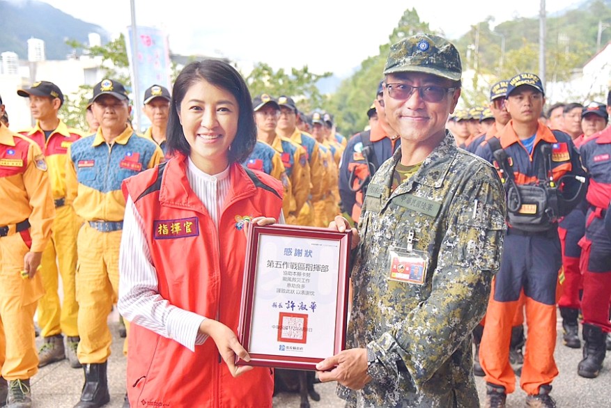 為感謝搜救人員辛勞,許淑華縣長8日下午到仁愛鄉公所頒發感謝狀,包括內政部消防署特種搜救隊、台中市政府消防局、新北市政府消防局特搜大隊、新北市政府義消特搜大隊、第五作戰區指揮部、南投後備指揮部等,約60人參加。