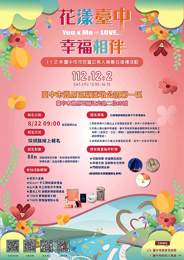 民政局說明,台中市112年聯合婚禮8月22日上午9時開放線上報名,限額88對,新人年滿18歲,其中一方在台中市設籍、就業,或台中市議會及台中市政府所屬公教人員符合報名資格者均可報名參加,活動當日還有機會抽中幸福鑽戒、承億文旅五館雙人聯合住宿券及金項鍊,報名詳情請至活動專屬網站查詢,歡迎準新人踴躍參加。